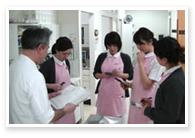 スタッフ全員が集まり、朝のミーティングを行います。当院では、一日の診療がスムーズに進むよう、ご予約を頂いている患者さんのカルテを全員でチェック。スタッフとドクターの全員で情報を共有しています。