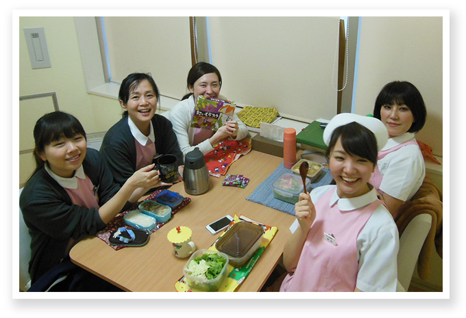 設備の整ったとっても広いスタッフルームでみんなで昼食をとります。全員がほぼ毎日手作りのお弁当なのですが、みんな料理上手で参考になります。作り方や栄養のことなどを教えてもらったりと楽しくタメになるランチタイムです(^<^)朝寝坊した日は、ほか弁になることも…。院長から頂いたお菓子をつまんだり、コーヒーを飲みながらワイワイガヤガヤ楽しくおしゃべりしています。みんな診療中よりも声が大きく、元気はつらつです。