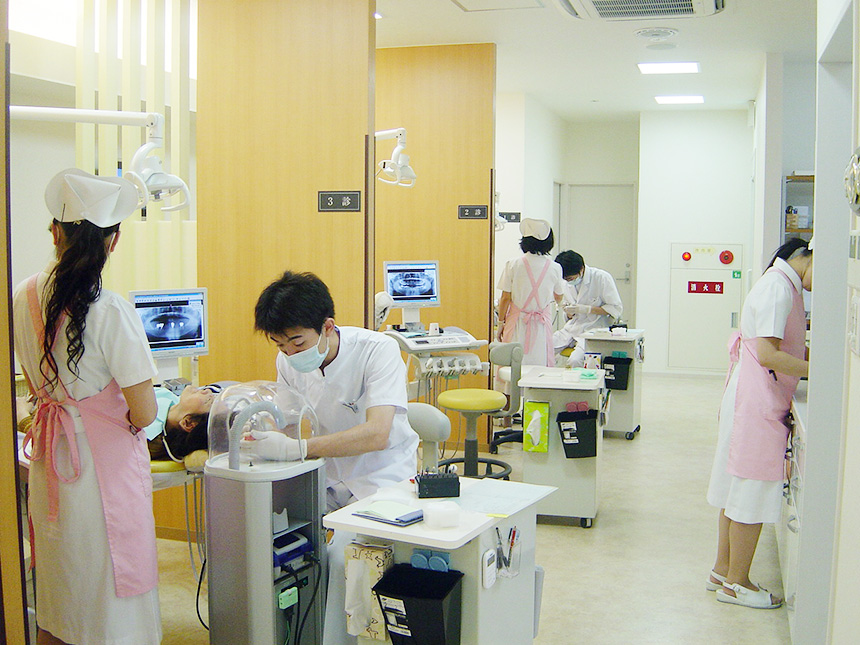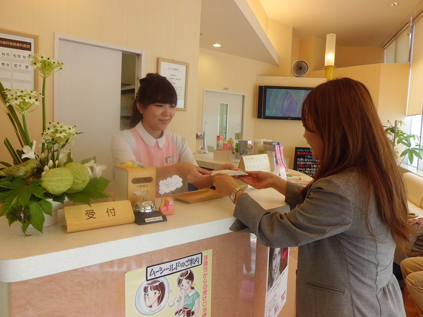 当院では受付と歯科アシスタントは兼務です。受付業務(カルテ準備、電話応対、会計、アポイント調整、急患対応、掲示物作成、待合室の整理整頓)、診療のアシスタント業務(器具の準備と片付け、バキューム操作、治療予定の説明、資料のお渡し、歯科材料発注)、院内清掃、月初めのレセプト業務など様々な業務が含まれます。最初は覚えることが沢山ありますが、マンツーマンで行う教育システムを用意しています。